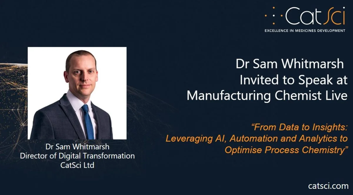 CatSci Ltd is thrilled to share that our Director of Digital Transformation, Dr Sam Whitmarsh, has been invited to speak at Manufacturing Chemist Live 2023. The conference takes place on 24th – 25th May in the National Conference Centre, Birmingham.