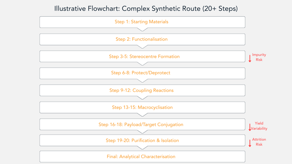 As demonstrated in Figure 4, synthesis often requires upwards of twenty discrete chemical steps, with each transformation demanding rigorous control of reaction conditions, stereochemistry, and impurity profiles. The risk of yield attrition increases exponentially with each additional synthetic step, making route design and process optimisation critical considerations at the earliest stages of development.