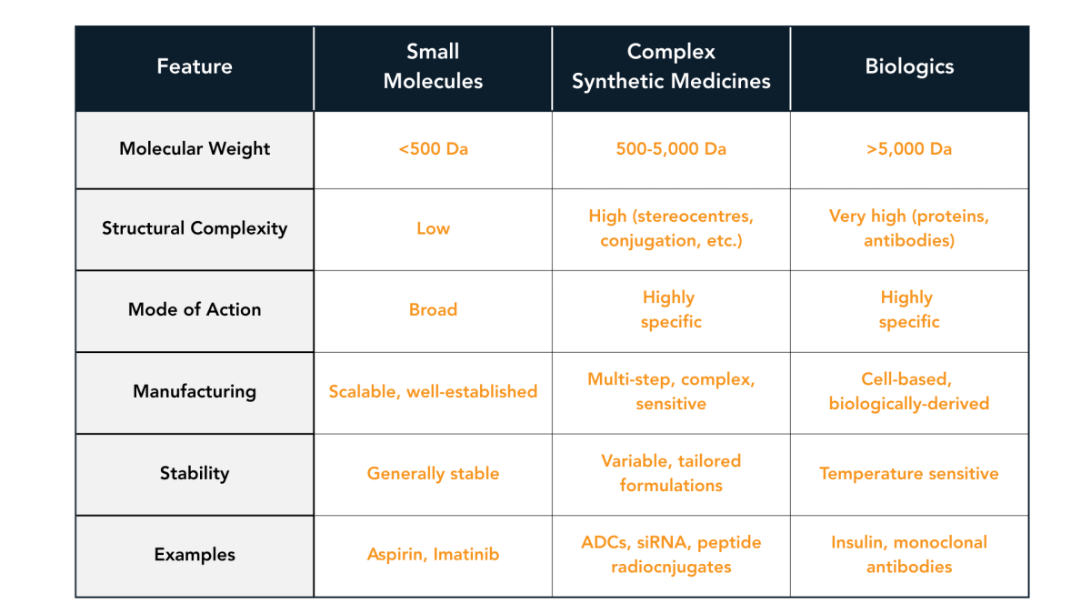 Figure 1 provides an overview of some of the key differentiators between traditional small molecules, complex synthetics, and biologics: