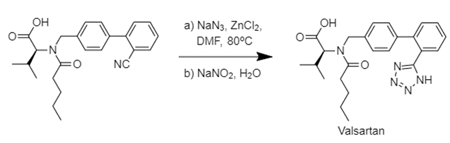 In the case of Valsartan, issues arose after an undisclosed change to the manufacturing process. However, the source of the issue is believed to lie in the tetrazole ring formation step. That transformation typically involves reacting an azide with a nitrile, under ZnCl2 catalysis with DMF as solvent. Sodium nitrite is then used to safely quench excess azide.