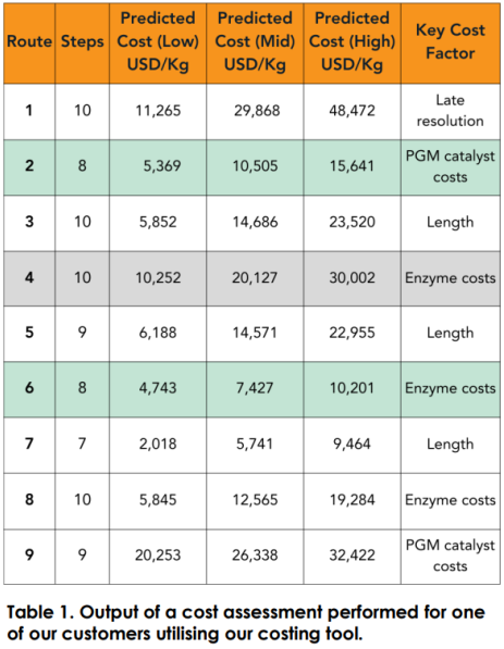 At the on-paper route ideation stage, it is not possible to ascertain an exact cost for the synthesis of a molecule. As such, we developed a simple costing tool that allows us to build relative and indicative costs for each route. We do this by considering: