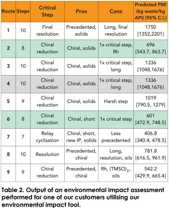 The tool has been shown to give a reasonable correlation between predictive and actual values. As well as a predicted PMI, we also highlight any specific reagents or intermediates which may not be ideal from an environmental or safety perspective.